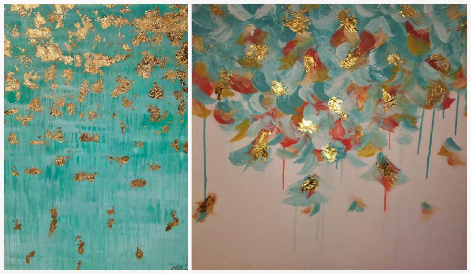The vibrant colours in this next painting made me think of a somewhat casual, somewhat dressy Living Room. A couple pops of colour with pillows and an ottoman paired with soft gold and wooden furniture pieces create a playful yet refined space.
